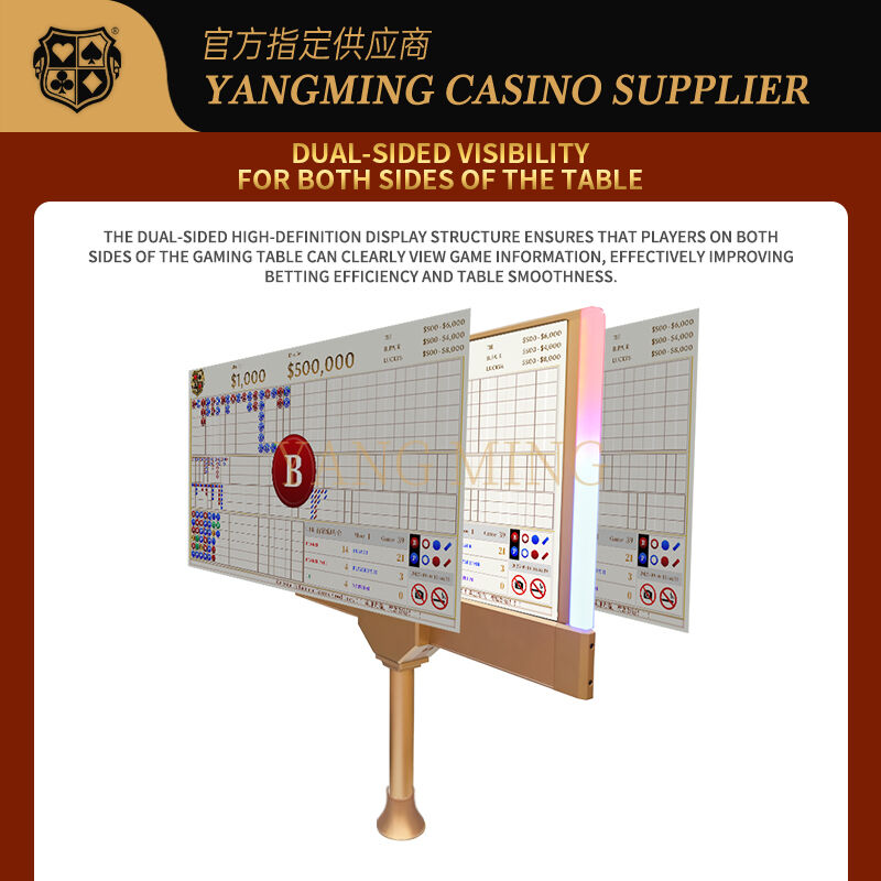 จอแสดงผลคาสิโนมีไฟ LED สว่างและดีไซน์ที่บางและทันสมัย ทำให้มองเห็นได้ชัดเจนจากทั้งสองด้านของโต๊ะสร้างขึ้นสำหรับการดำเนินงานคาสิโนอย่างต่อเนื่อง ให้ประสิทธิภาพที่เสถียร กราฟิกที่สดใส และมุมมองที่กว้าง เหมาะสำหรับบาคาร่าและเกมบนโต๊ะอื่นๆ รองรับเนื้อหาที่ปรับแต่งได้ การแสดงผลหลายภาษา และการสร้างแบรนด์โลโก้เพื่อเพิ่มประสิทธิภาพการจัดการเกมและการนำเสนอคาสิโนโดยรวม